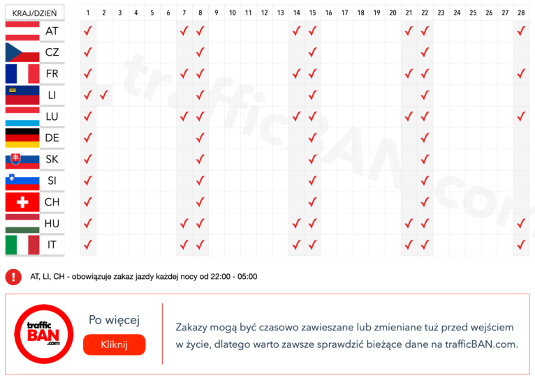www.trafficban.com w zakładce każdego z państw znajdziecie szczegółowe informacje dotyczące ograniczeń dla ciężarówek, w tym listę odstępstw i zwolnień z zakazów.