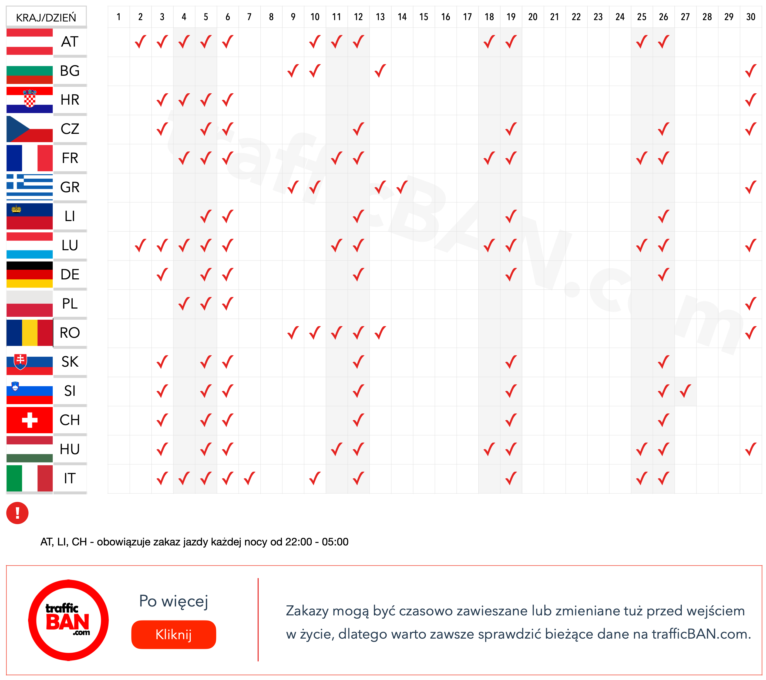 W serwisie www.trafficban.com w zakładce każdego z państw znajdziecie szczegółowe informacje dotyczące ograniczeń dla ciężarówek, w tym listę odstępstw i zwolnień z zakazów.